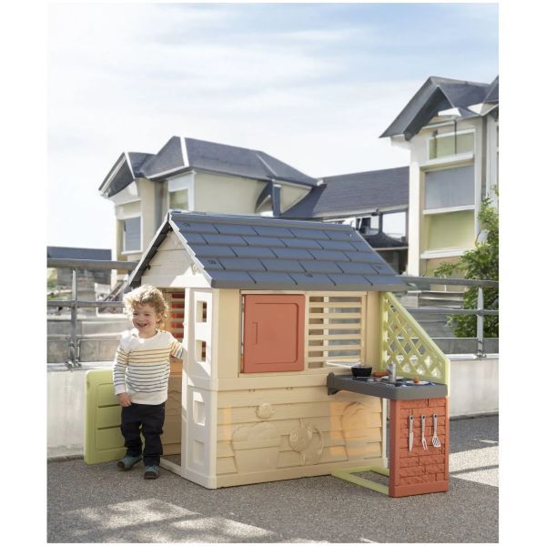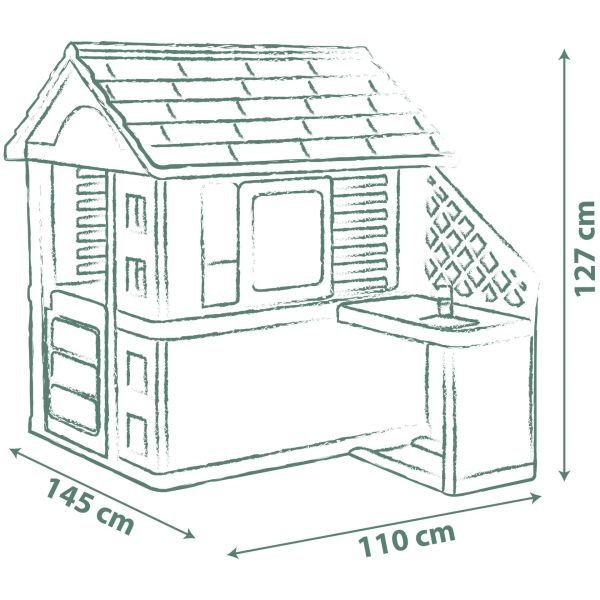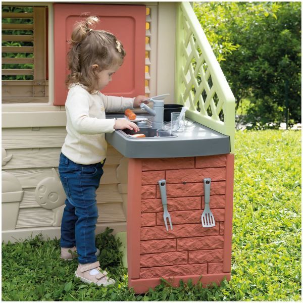 Domček na hranie má tiež kuchynský kút, kde si malé deti môžu pripravovať vlastné malé jedlá s dodanými príslušenstvami. Interaktívne prvky, ako sú dvere a okná, ktoré sa otvárajú, robia hru ešte zaujímavejšou. Domček je vyrobený z robustného plastu s UV odolnou vrstvou, aby odolal poveternostným vplyvom mnoho rokov. Výrobok je vyrobený z veľkej časti z recyklovateľných materiálov.